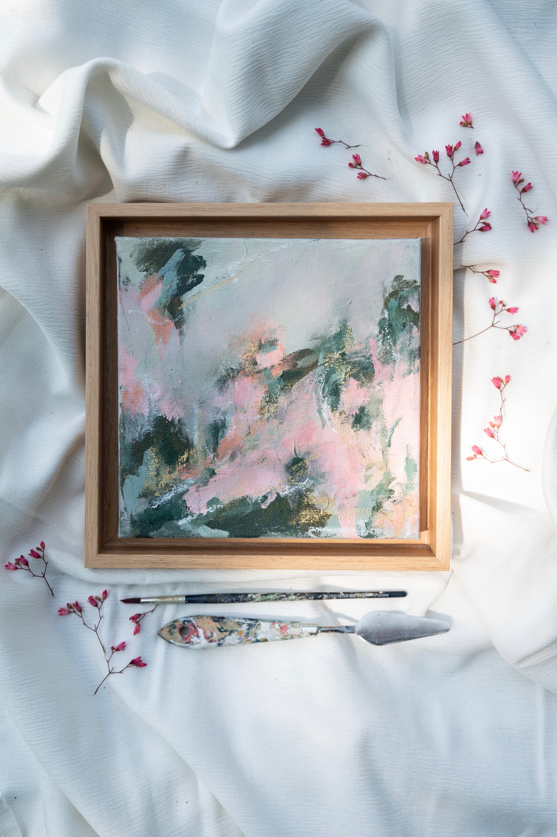 An original mixed media painting, 20 x 20 cm canvas, 24 x 24 cm framed, acrylic paint, oil pastels, watercolor pencil. This piece comes framed in a wooden floater frame and is ready to hang.