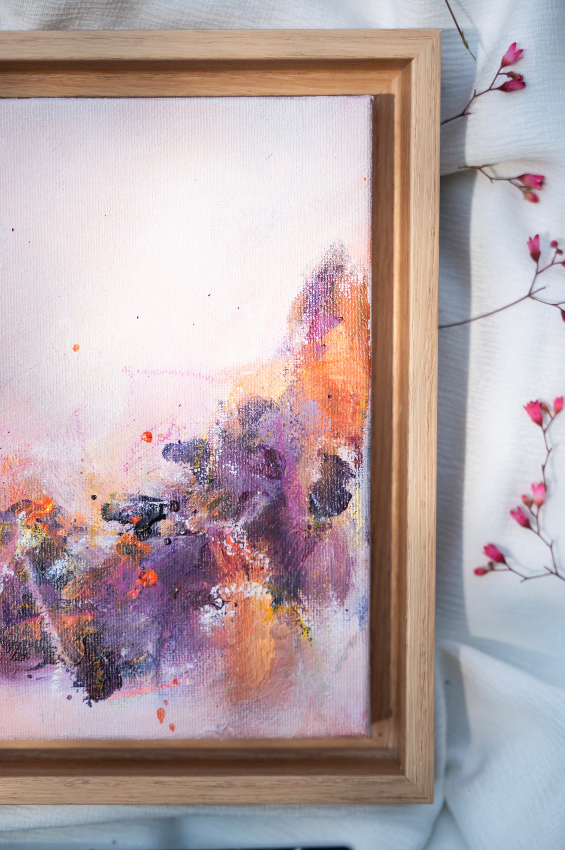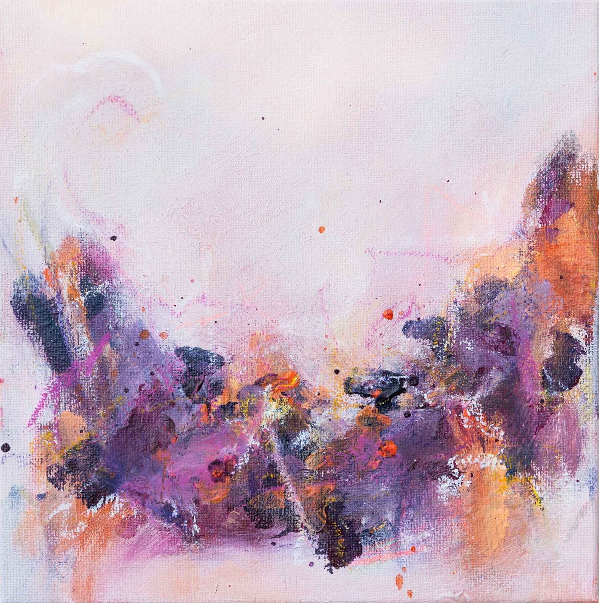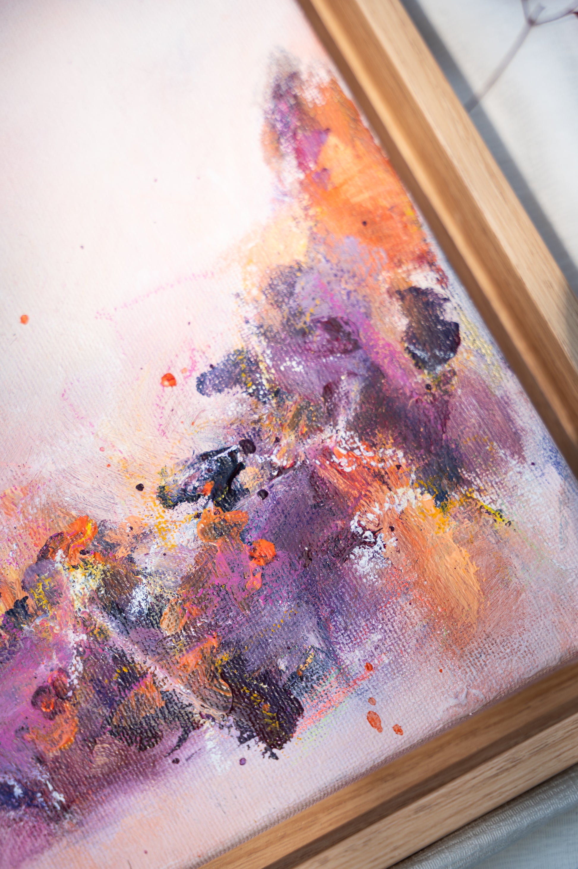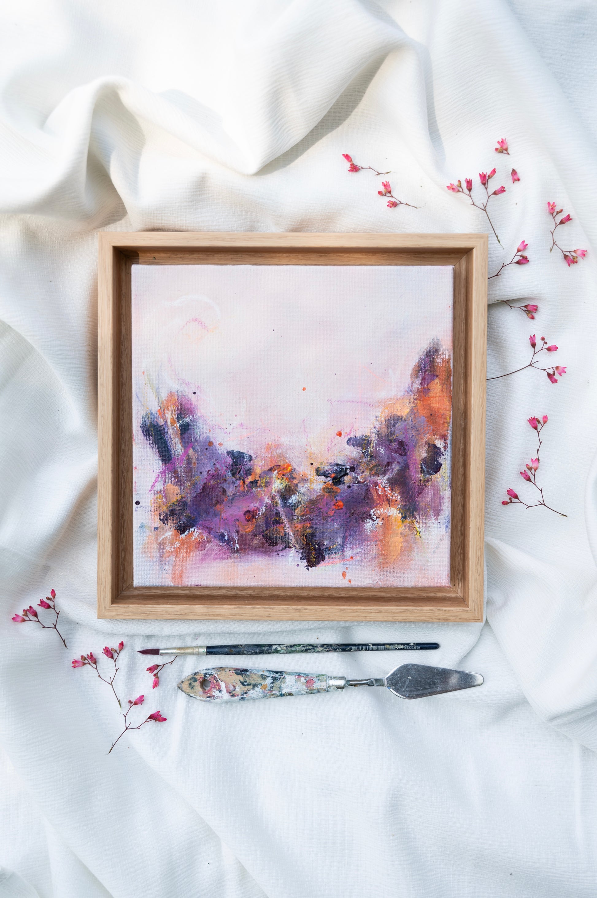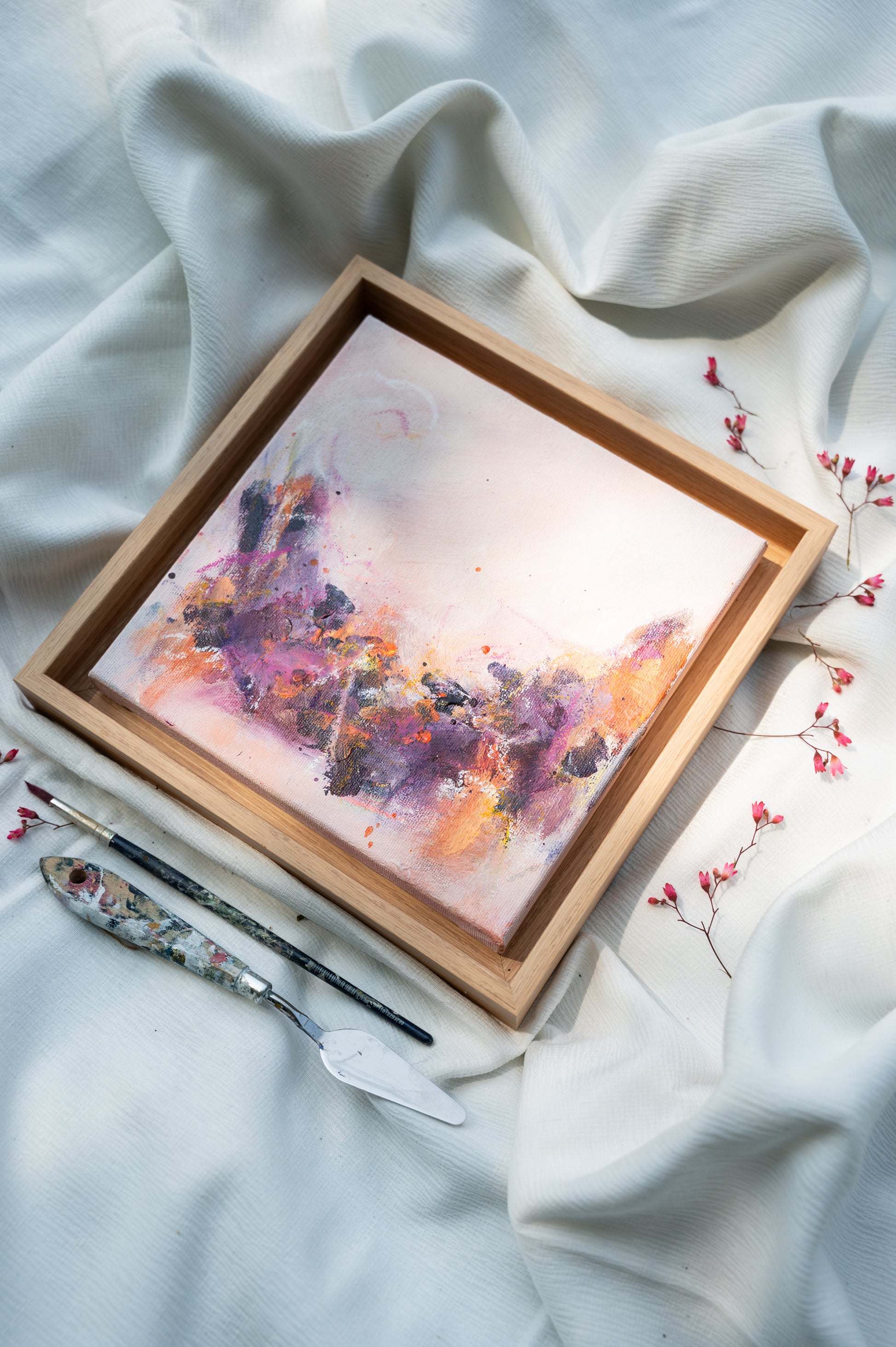 An original mixed media painting, 20 x 20 cm canvas, 24 x 24 cm framed, acrylic paint, oil pastels, watercolor pencil. This piece comes framed in a wooden floater frame and is ready to hang.
