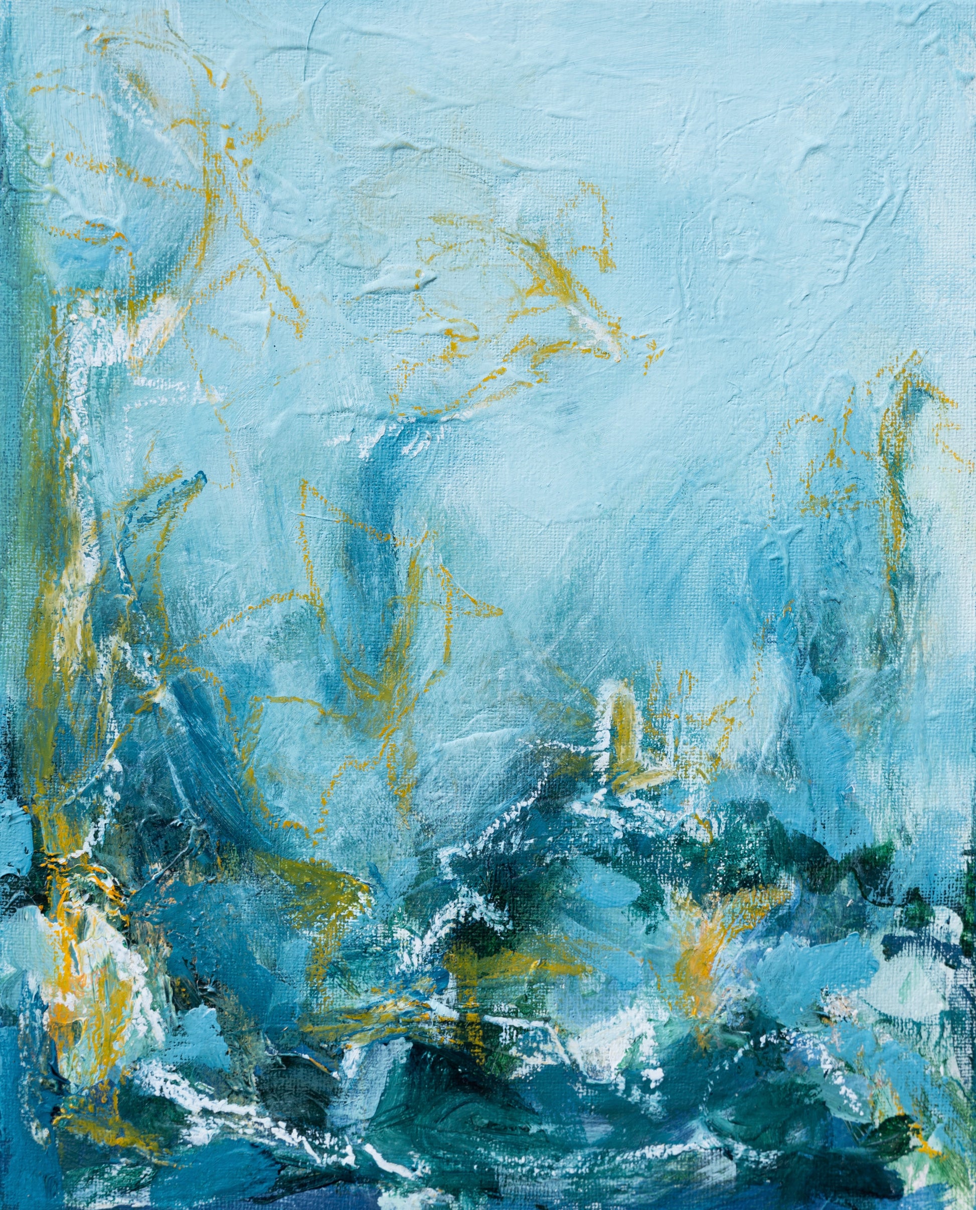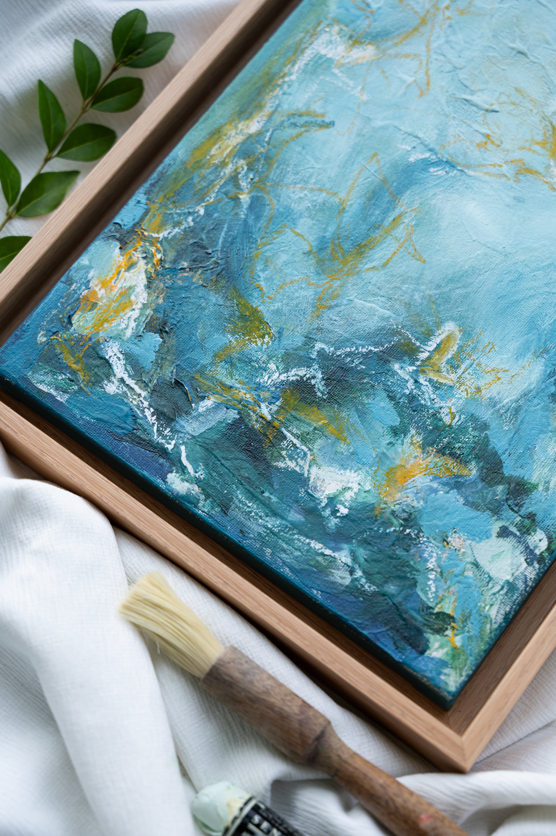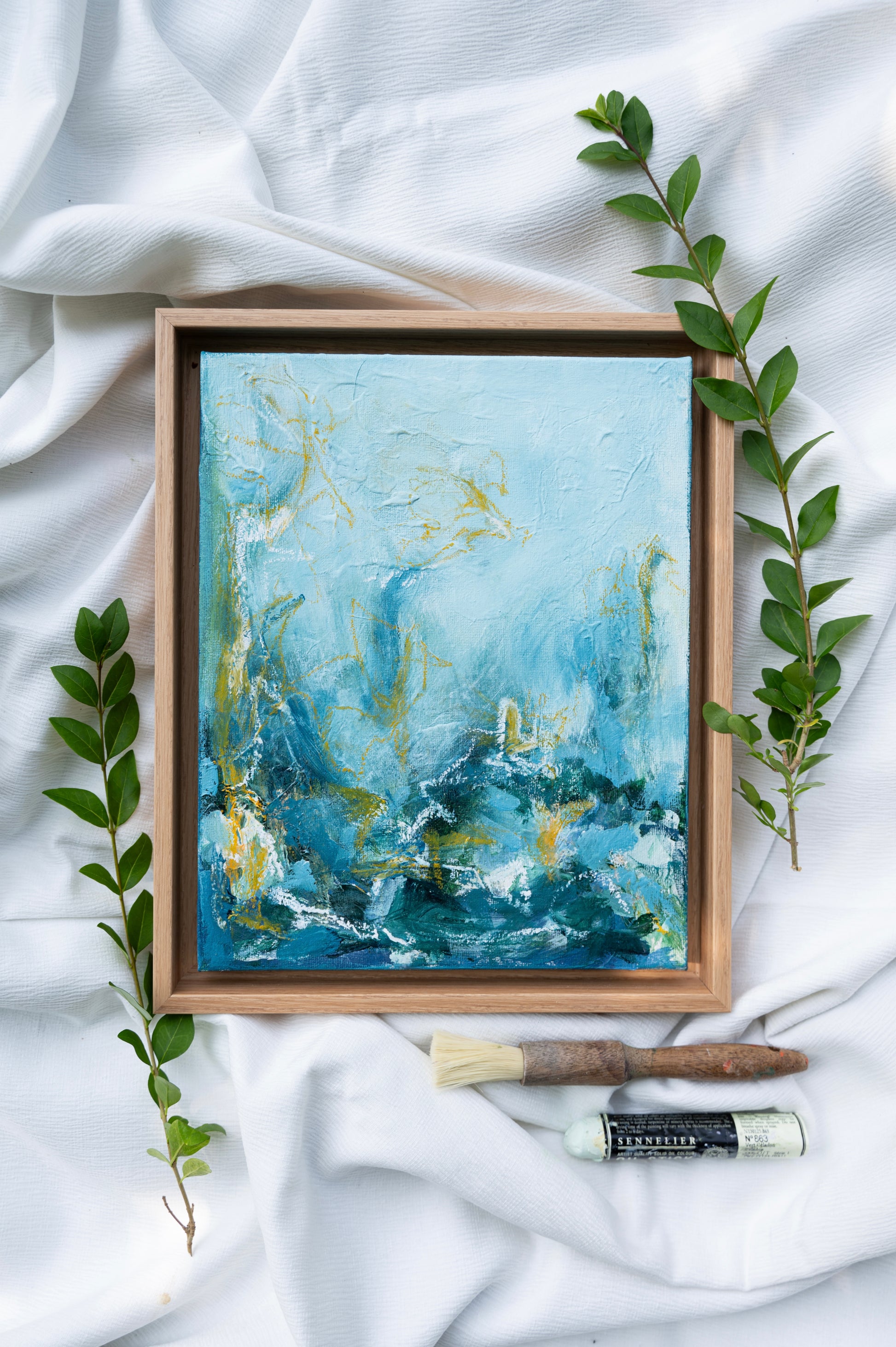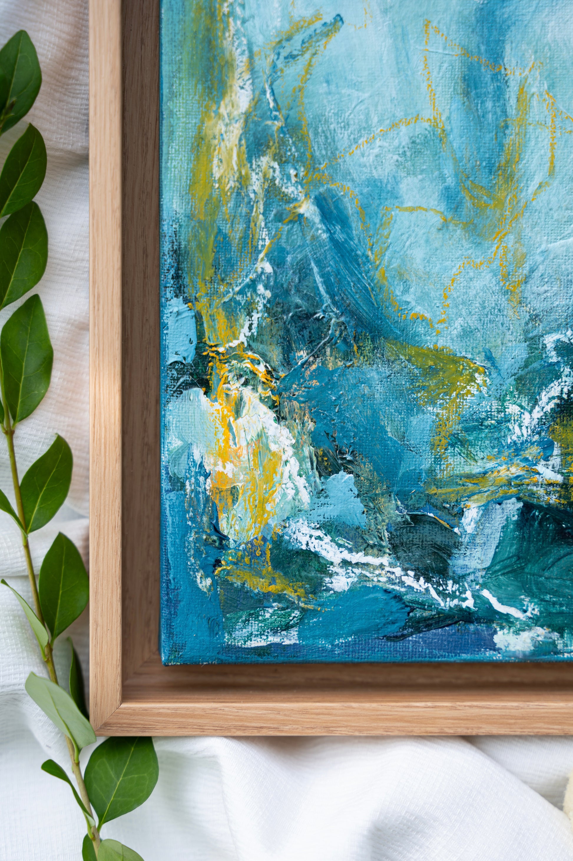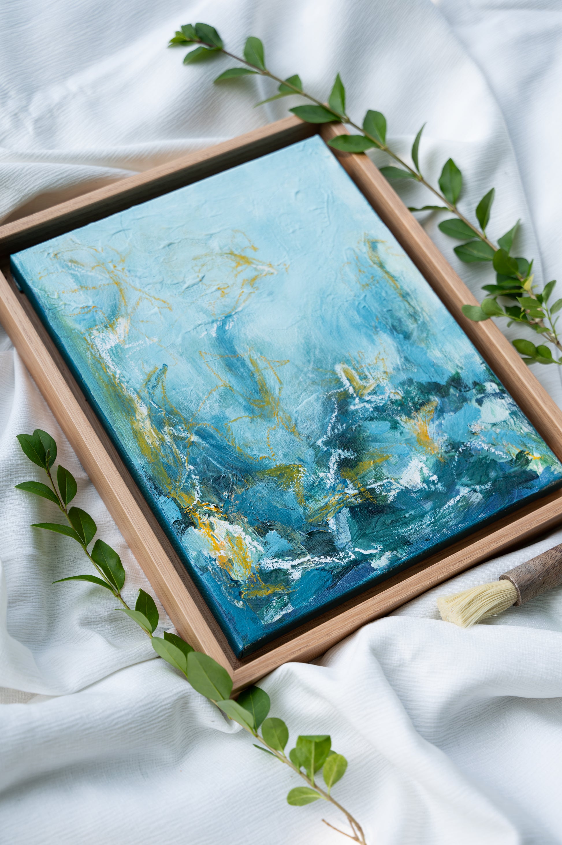 An original mixed media painting, 30 x 24 cm canvas, 34 x 28 cm framed, acrylic paint, oil pastels, watercolor pencil. This piece comes framed in a wooden floater frame and is ready to hang.