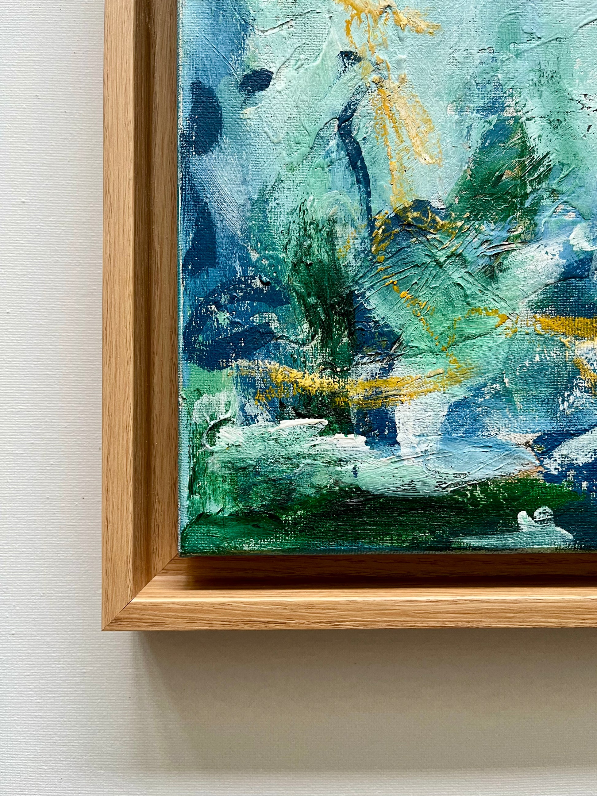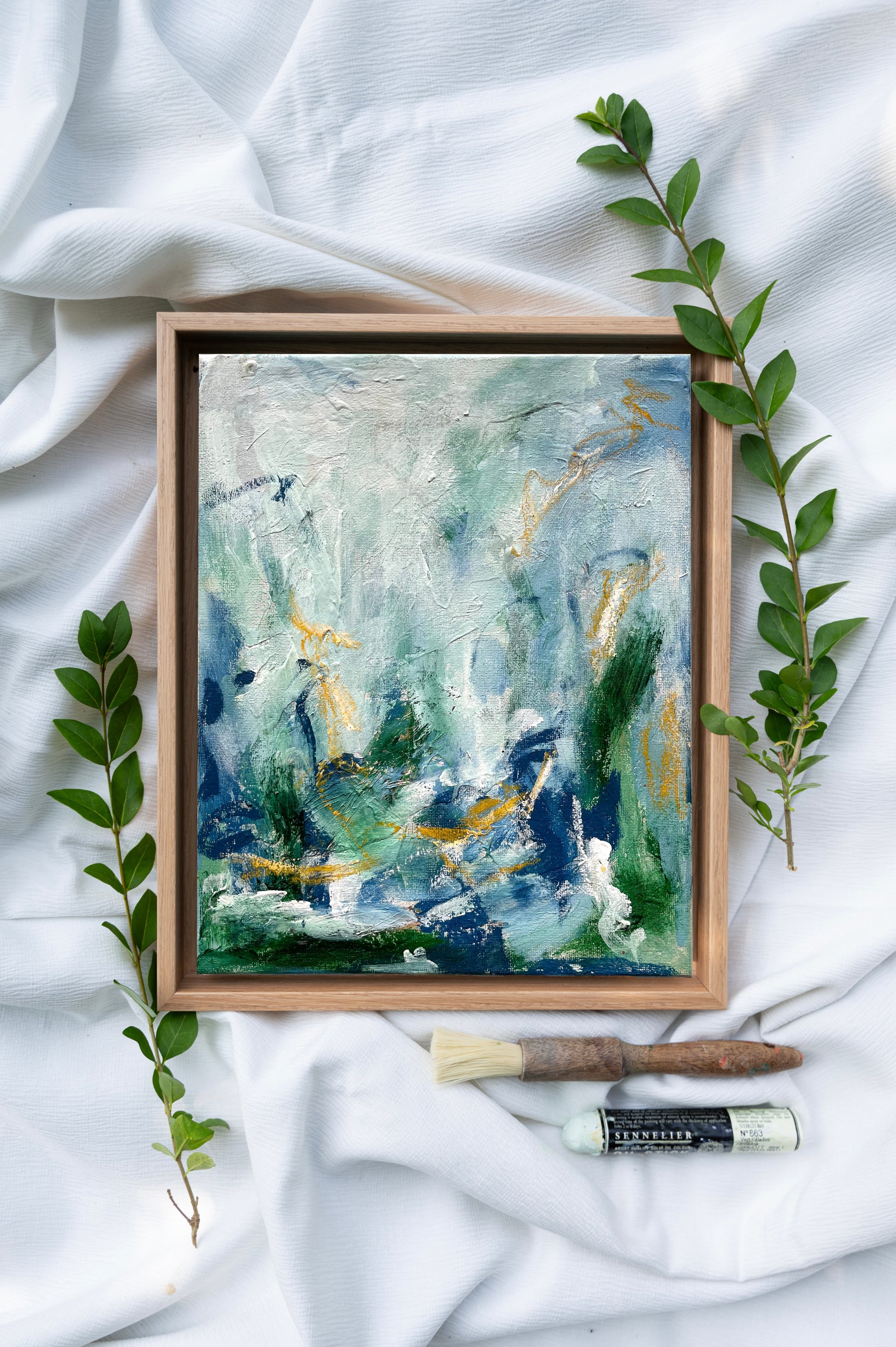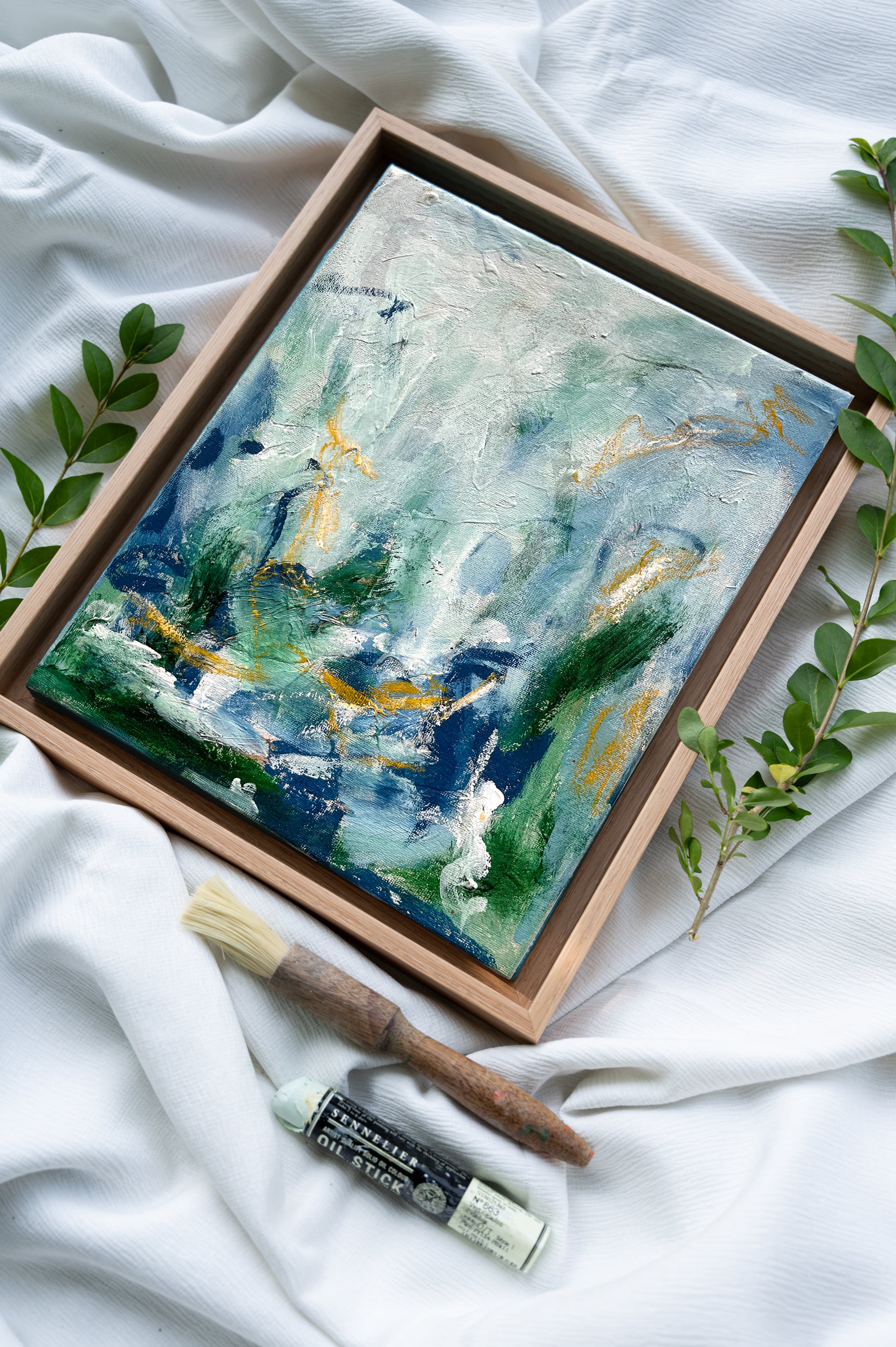 An original mixed media painting, 30 x 24 cm canvas, 34 x 28 cm framed, acrylic paint, oil pastels, watercolor pencil. This piece comes framed in a wooden floater frame and is ready to hang.