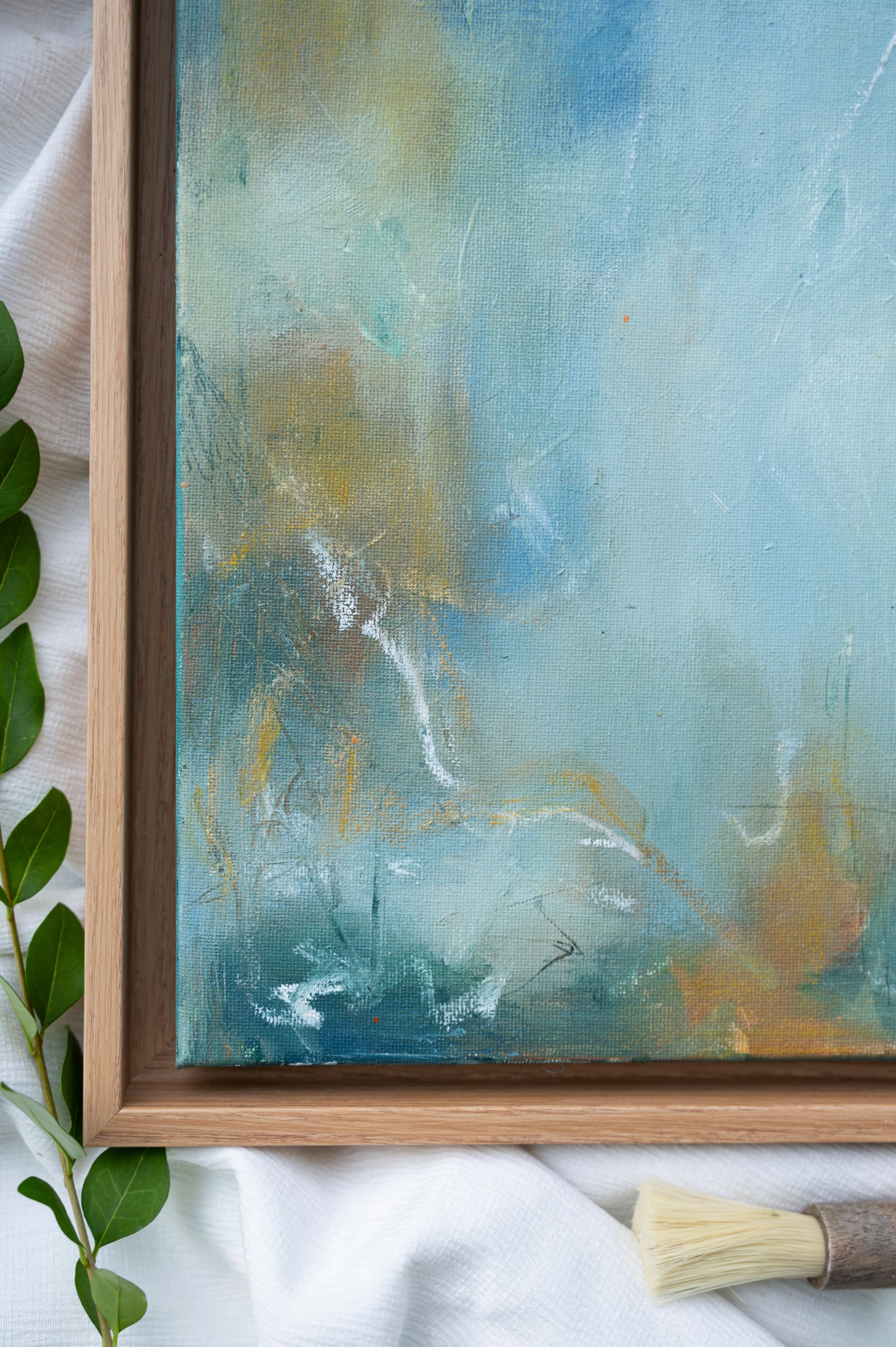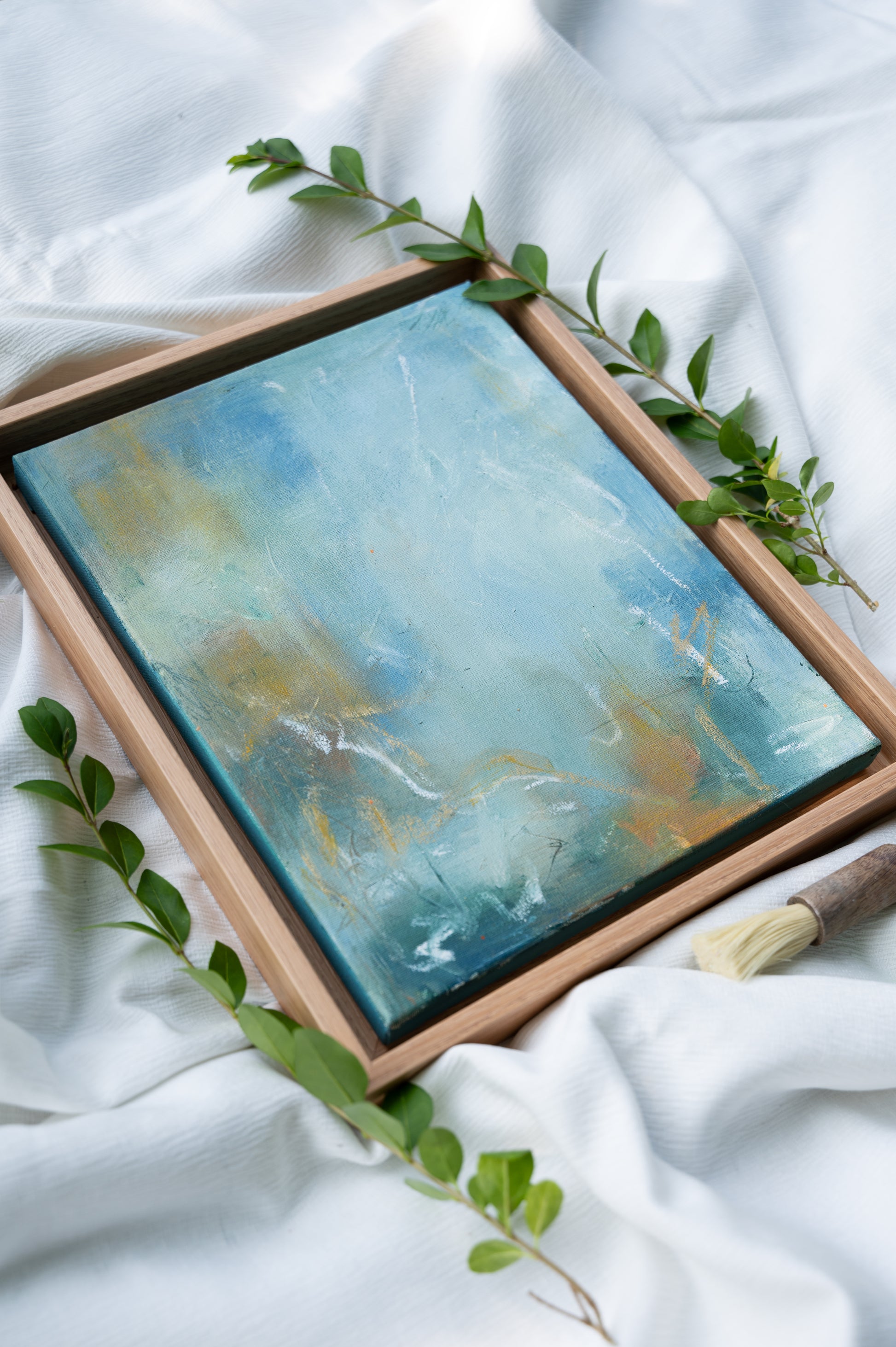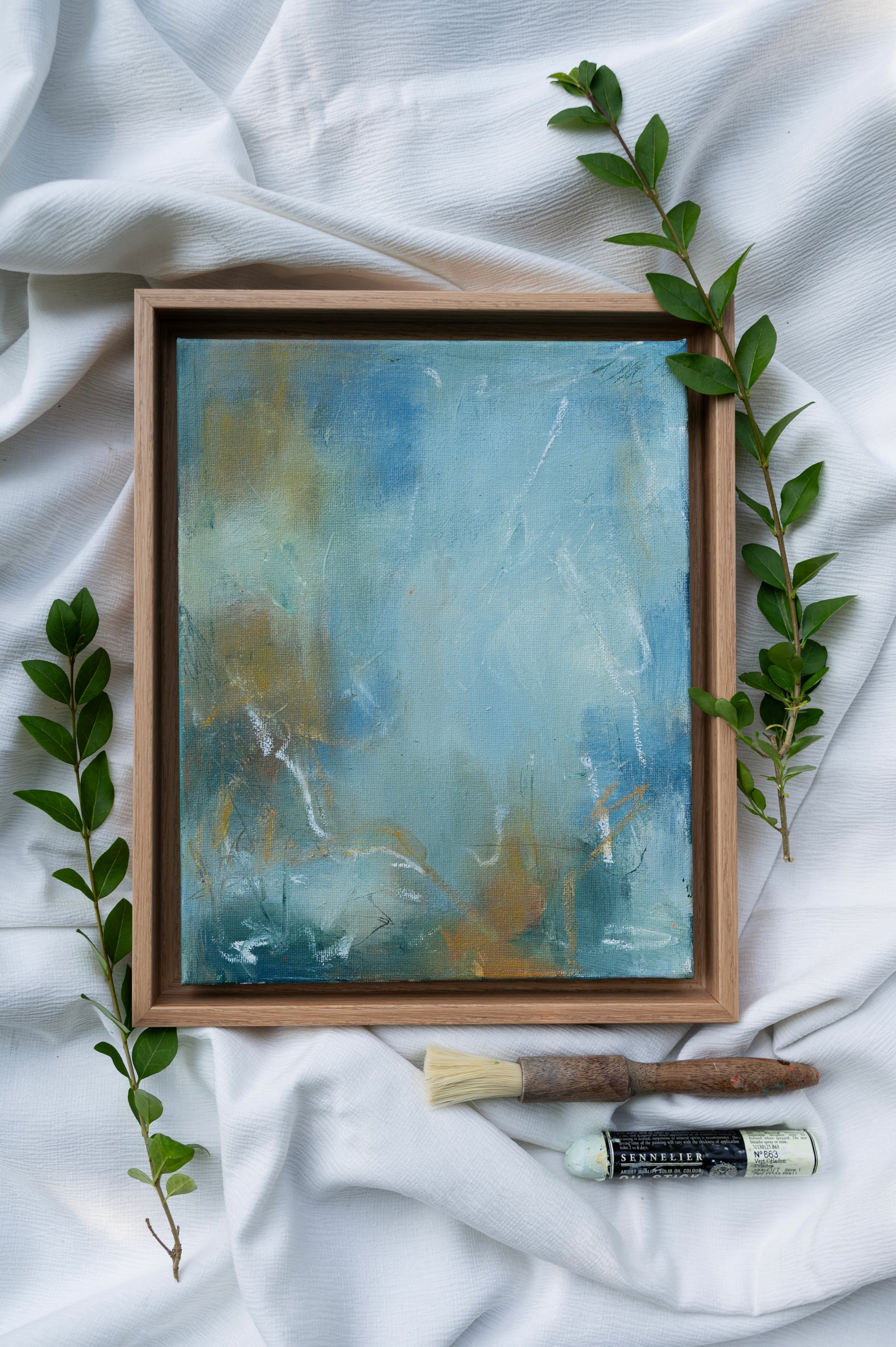An original mixed media painting, 30 x 24 cm canvas, 34 x 28 cm framed, acrylic paint, oil pastels. This piece comes framed in a wooden floater frame and is ready to hang.