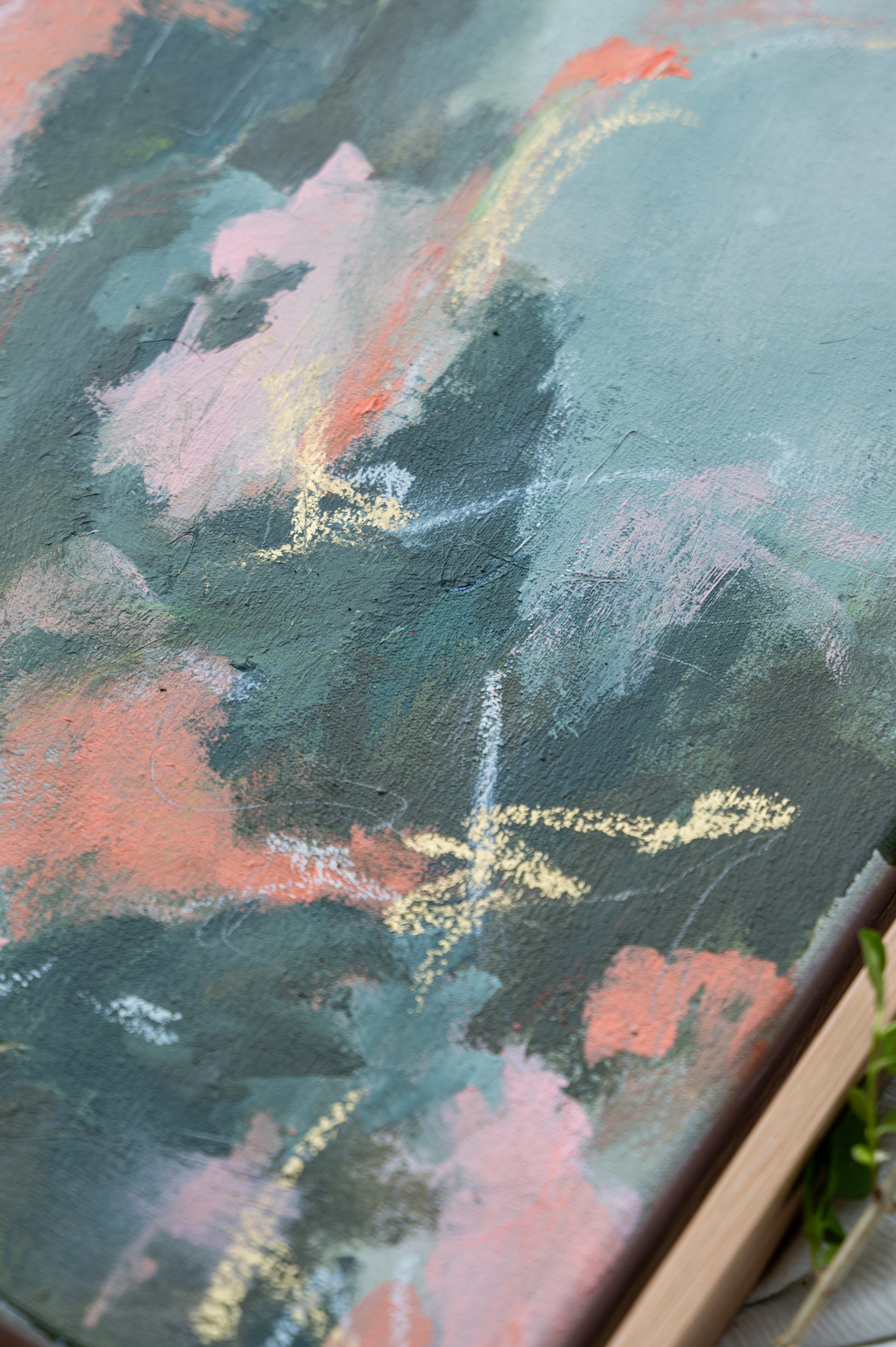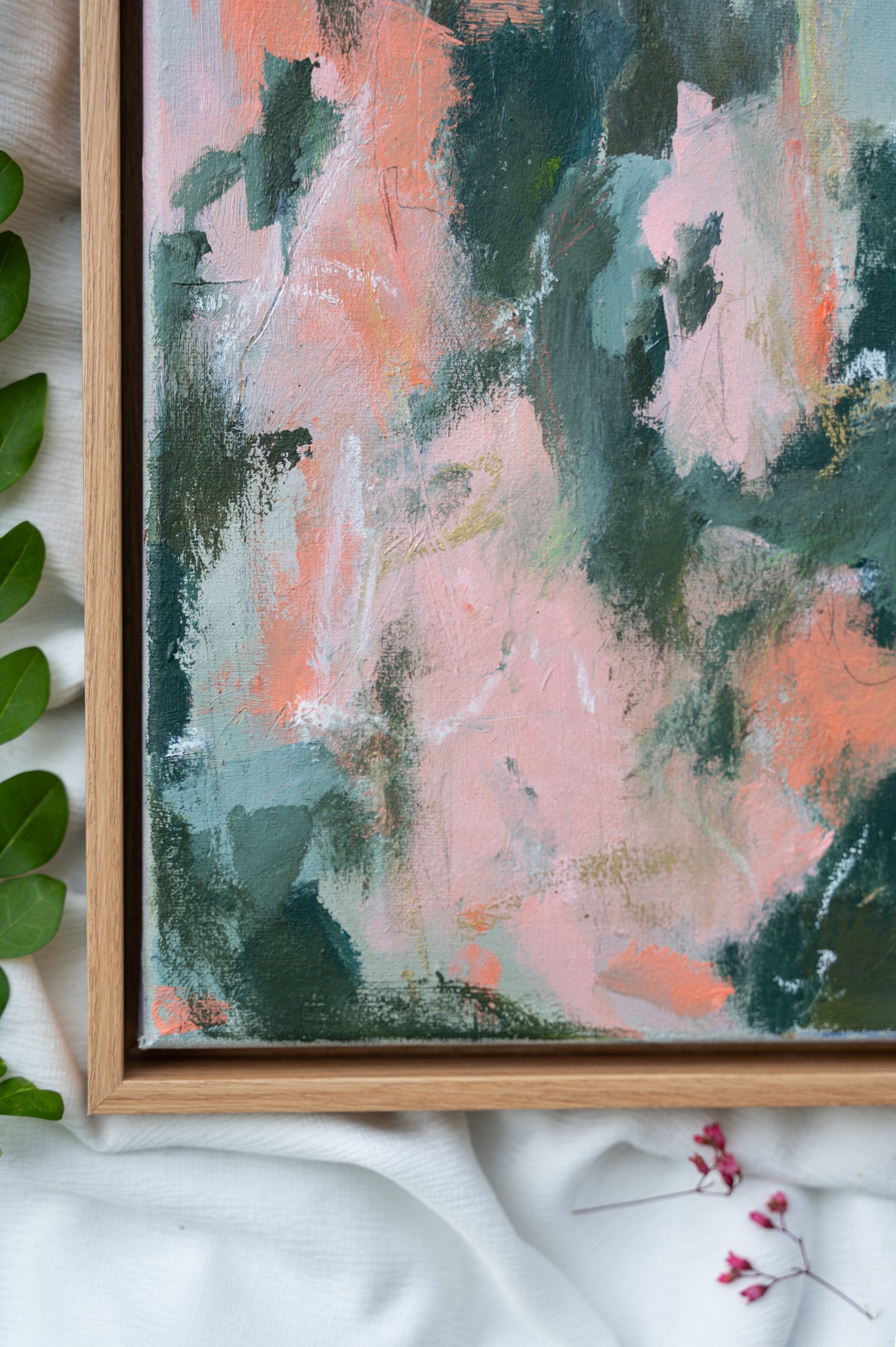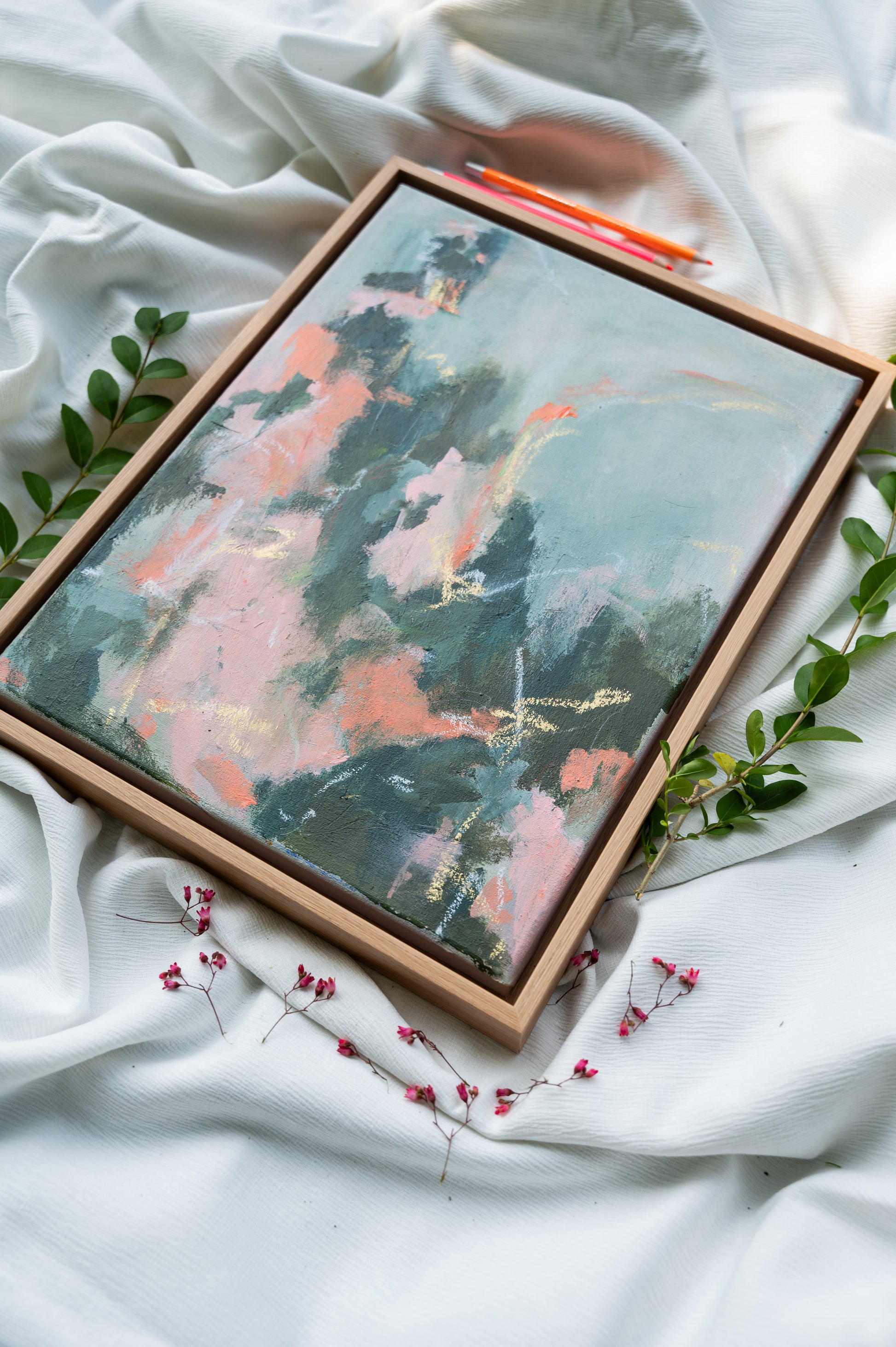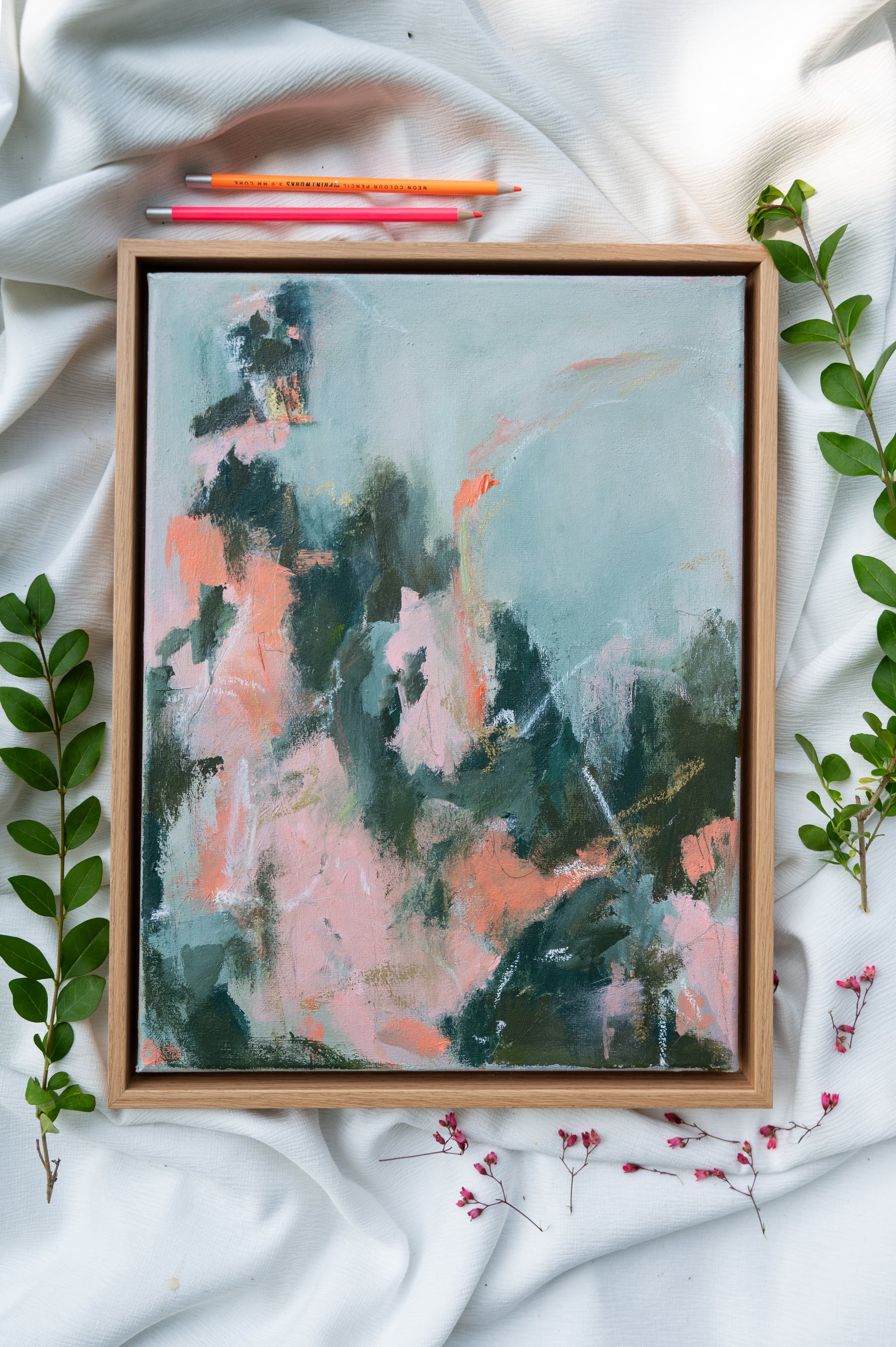 An original mixed media painting, 40 x 30 cm canvas, 43 x 33 cm framed, acrylic paint, water color pencils. This piece comes framed in a wooden floater frame and is ready to hang.